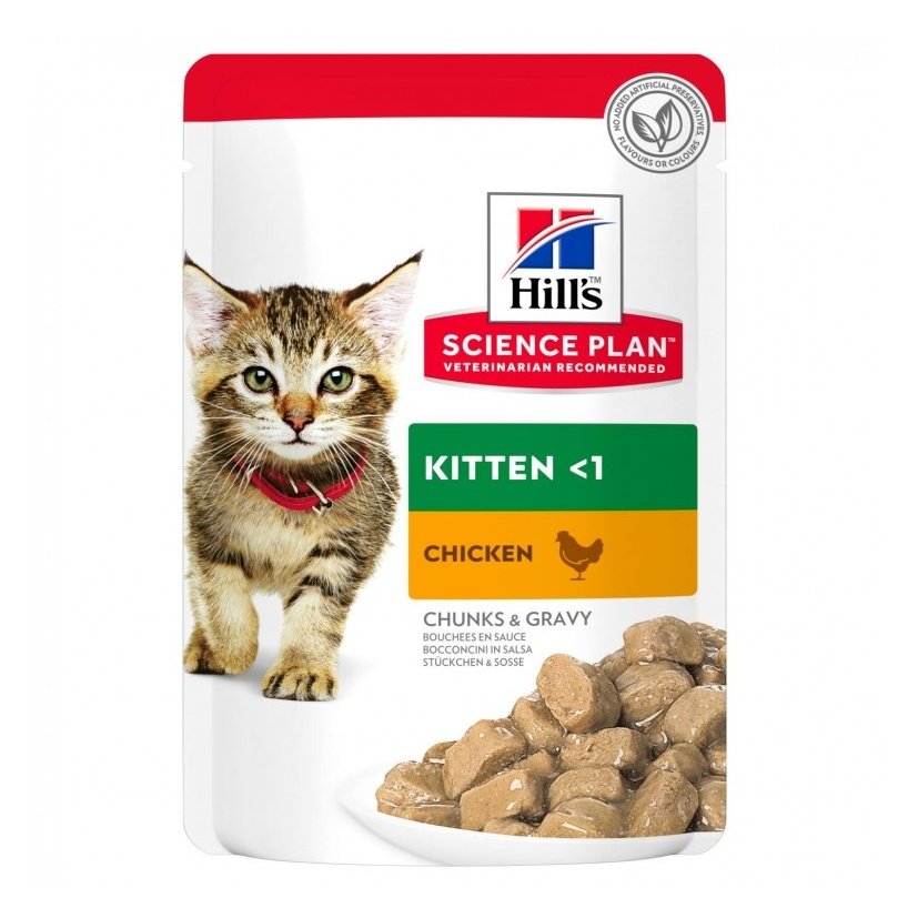 Your kitten will love the taste of HILL'S SCIENCE PLAN Kitten chicken cat food tender chunks in gravy. It has the perfect balance of taste and nutrition for your kitten. Precisely balanced to deliver the appropriate amount of energy to support ideal body weight in kittens <1 year.