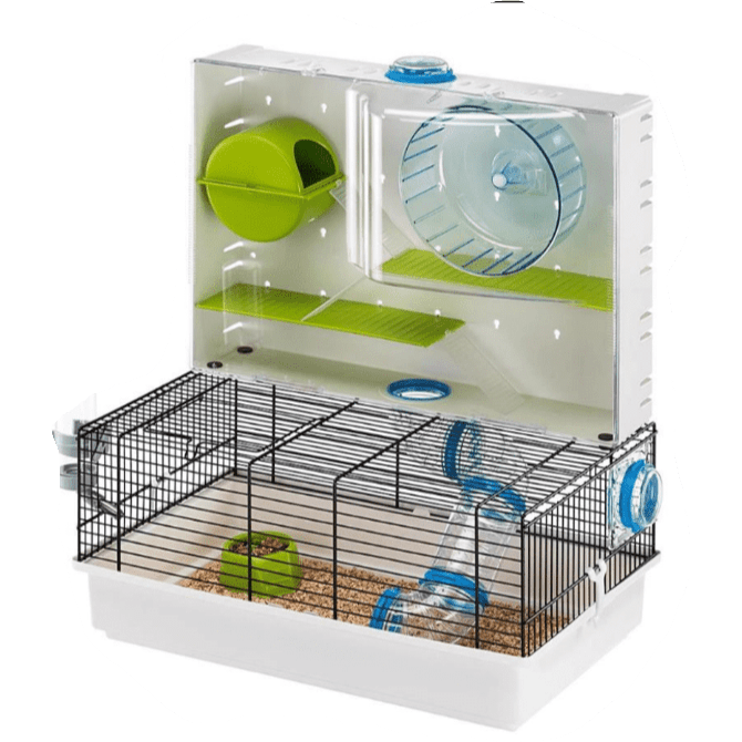 If your rodent is always on the move, loves to play and never stays still, then the Olimpia hamster cage is perfect for him. This habitat offers ample space in which your cute friends can play freely. Its structure consists of a classic wire mesh cage and a special vertical section covered with transparent plastic, in which there are paths with a wheel, a little house, shelves and ladders, all for recreation and exercise. In the bottom part of the cage, you will also find useful accessories, including a drinking bottle and a plastic food bowl. The transparent tubes connected to each other allow your hamster to move from the first floor to ground floor. These parts are also available as modular accessories. They can be used to make numerous combinations and can also be added to other products to create additional play areas. In fact, by attaching the tubes, which can be straight or curved, to the special connection on the side of the Olimpia cage, you can extend the path dedicated to your little rodent.