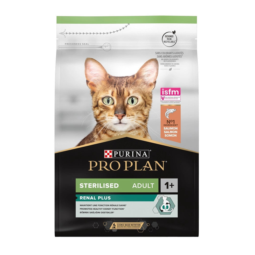 Purina Pro Plan Sterilised Cat Optirenal - Rich in Salmon is a premium dry cat food with tuna and salmon, formulated especially for neutered or sterilised cats. Neutering alters a cat's metabolism, so general energy requirements are lower. Purina Pro Plan Sterilised Cat Optirenal - Rich in Salmon offers protein-rich, low-fat nutrition. After sterilisation the risk of urinary tract illnesses (FLUTD) is increased, so this dish uses a special recipe to reduce the risk of urinary stones.