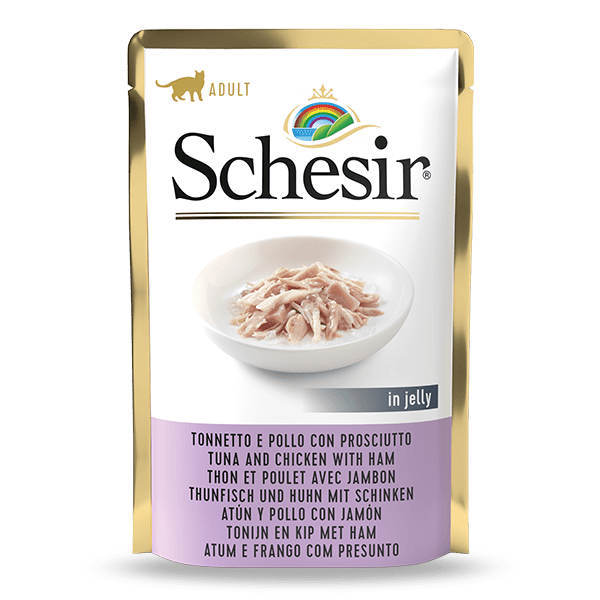 This delicious Schesir recipe is based on real tuna and chicken fillets, paired with an appetizing ham topping, for a mouthwatering flavour combination. The dish is in a jelly to satisfy cats who prefer a natural flavour, but with a more compact consistency in the bowl.